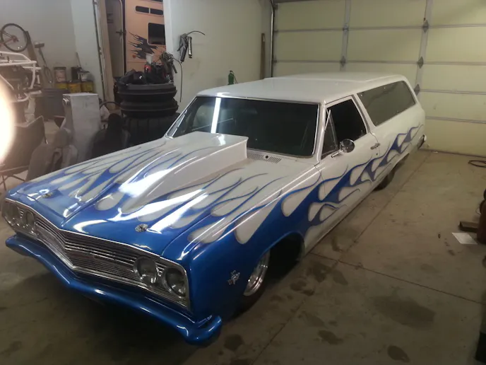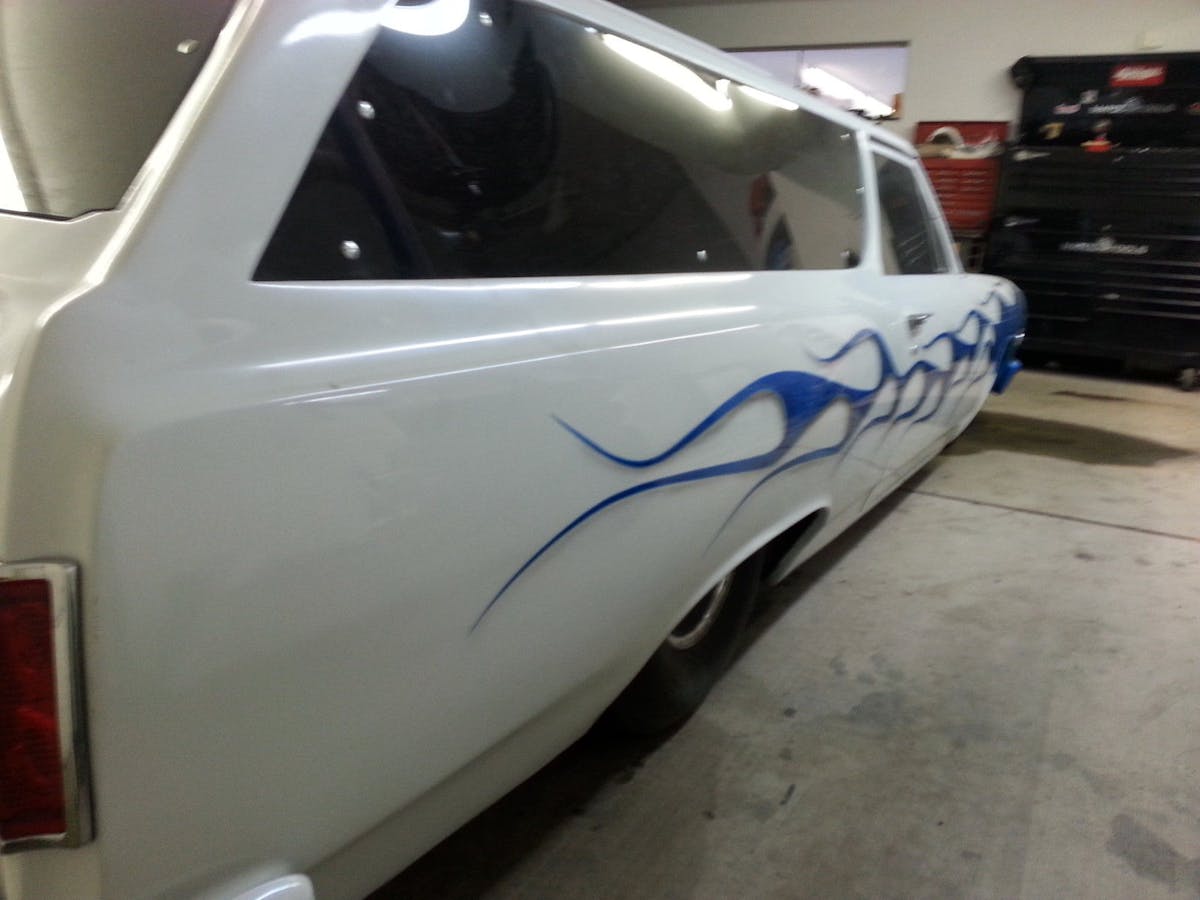 Along with a drop that’s planted it almost firmly on the ground, this wagon has been done up in a radical flamed paint scheme that differentiates it from the norm, with a white base color and some well laid-out blue flames that stretch all the way down the long, sleek sides of the car. The tall cowl hood and blacked-out windows just add to the bitchin’ appearance.