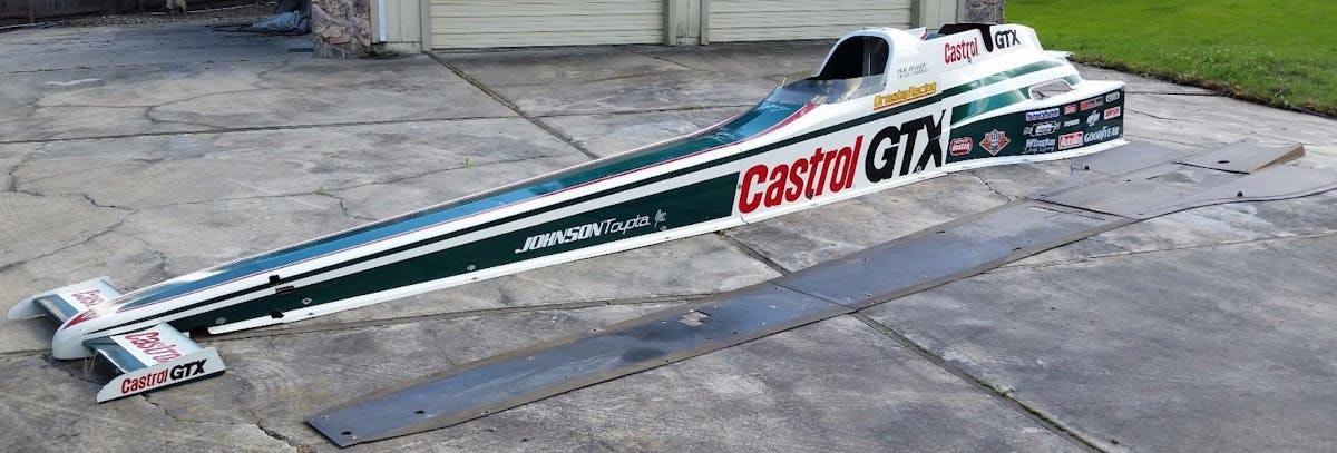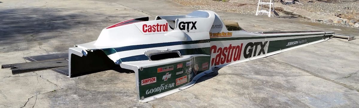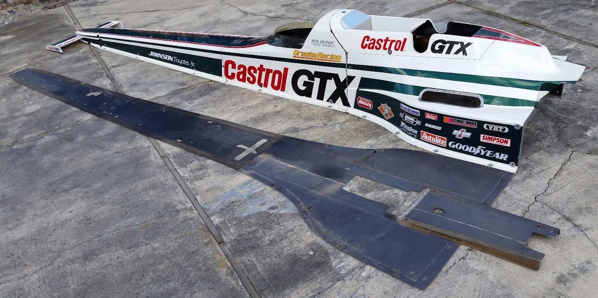 The car was converted back to traditional bodywork for 1987 and continued to be raced, but the iconic streamliner body was, thankfully, saved for posterities sake and is now up for sale for the semi-princely sum of $35,000. The team saved everything, including the front wing, two painted nose pieces, front section , the drivers compartment section, rear enclosure, and the full belly pan, and now, it can be one hell of a conversation piece for a drag racing collector.