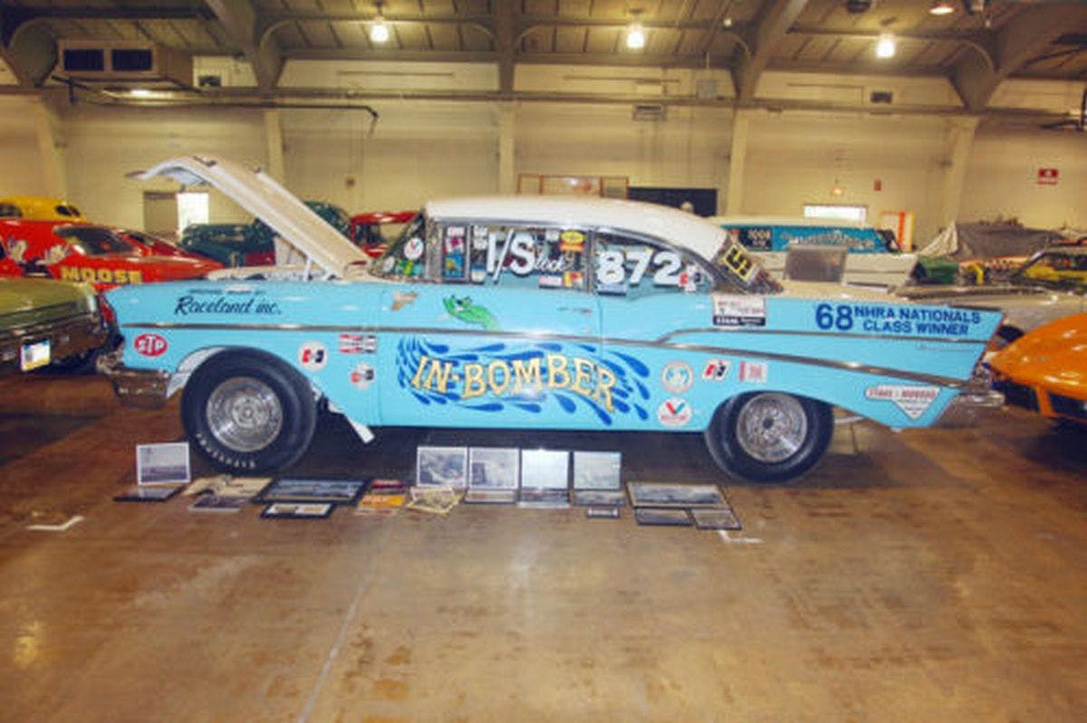 The In-Bomber was part of a three-car team, including Don Stephenson’s “Tension” ’57 210 sedan and Fred Anderson’s “Good In-Tension” ’57 Bel Air. For 1969, when it raced at the Winternationals, the NHRA Springnationals, and the U.S. Nationals, the car received dual carbs, and the top of the car was painted white. This is how the car is presented today.