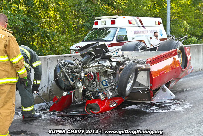 “Burnley was running solid 6.10’s all weekend and MPH’s in the 230+ range which is normal for this this team. After the burnouts, both were beginning to bring their cars into the beams; Burnley was having trouble with the reverser, not uncommon in the heat but it finally went into gear. The tree dropped and opponent Marinis dropped a -.004 on his side giving up the win to Burnley, Until the “first or worse scenario” came into play. Ed Burnley stayed in a strong pass as the car started closing in on the center line it took a hard turn into the wall in a massive blast of parts flying with some fire able to be seen from the starting line. This move the car made into the wall came before the finish line at around 1,100feet and at well over 200mph making Dean Marinis the eventual winner in the nitrous session. Supercharged / Turbocharged was cancelled as damage to the retaining walls was major. The final pairing in this class would have been Kevin McCurdy “Supercharged Camaro” vs. Steve Drummond “Twin Turbo Mustang”. As the car came to a halt pushed against the wall on its roof, the emergency crews were on hand with EMT’s and track officials already in emergency mode. You cannot say enough about the response time and how well they take steps to be prepared.”
