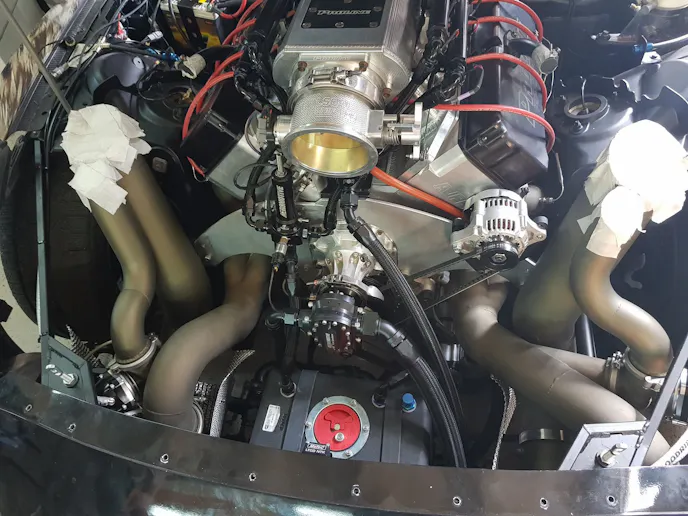 “It took a lot of work to get the engine to fit under the hood of the GTR. There isn’t that much room, so we had to do a lot of trial fittings to see how to lay things out. It took a lot of time, but we eventually got it figured out and placed everything in the most optimal locations. The other big challenge was building the headers and piping due to the space confines with the 481X. We had to get very creative to make them fit how we wanted so they would function properly.”