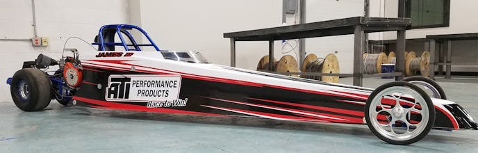 As the “pour” takes place in the ATI Performance shop for James’ new dragster, one of the humorous anecdotes to the process was again related to his small stature. J.C. chuckled as he describes, “as the ISP forming mix was setting up, we had to keep pressure pushing down on young James’ shoulders. As the foam expands slightly, it was pushing him upward in the seat.”