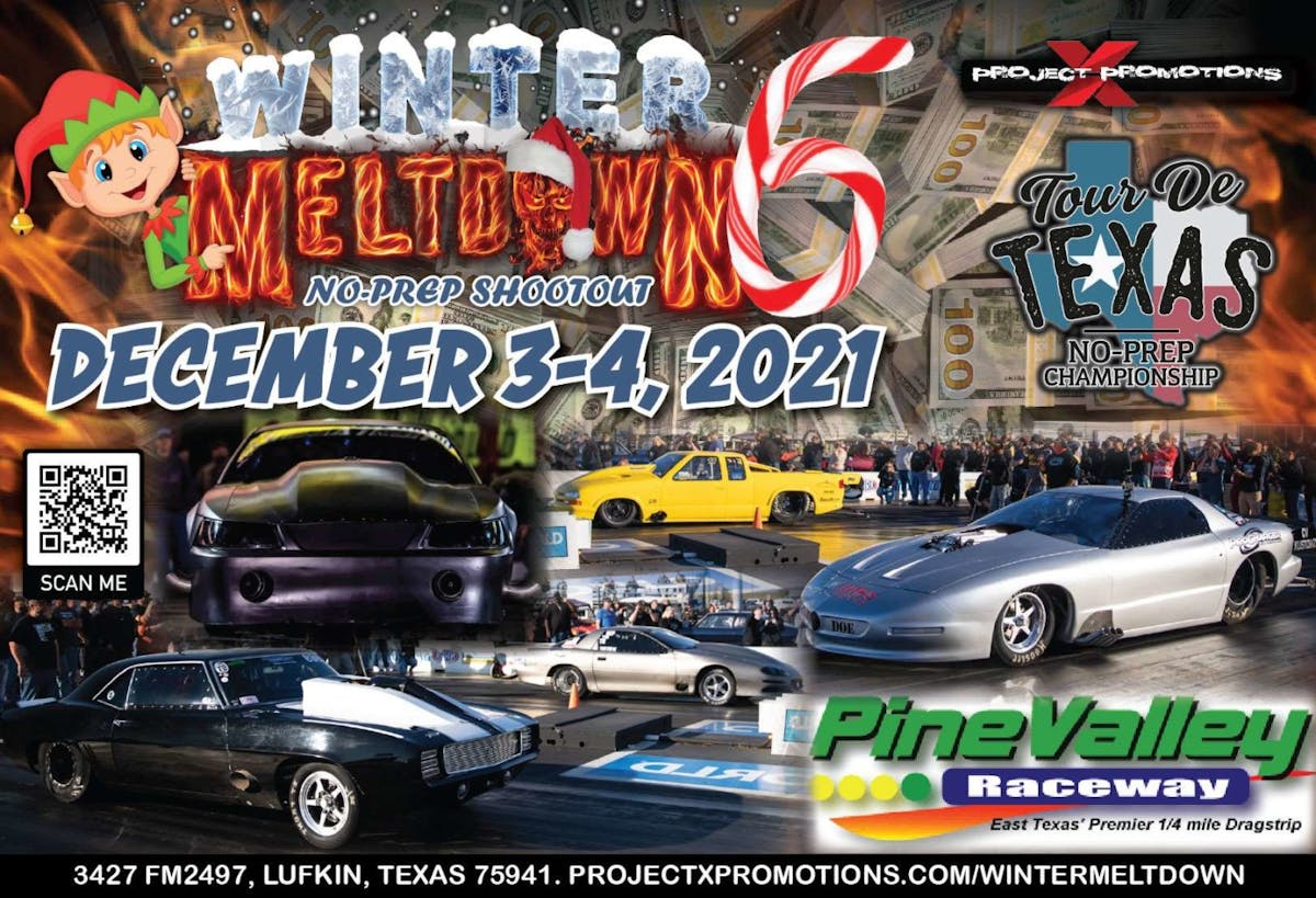 Project X Promotions’ Winter Meltdown 6 No-Prep Shootout moves to Pine Valley Raceway in Lufkin, Texas, for its 2021 running over the weekend of December 3-4, and plenty of the biggest names in no-prep racing will be on the property to try and lay claim to the prize money and paychecks!