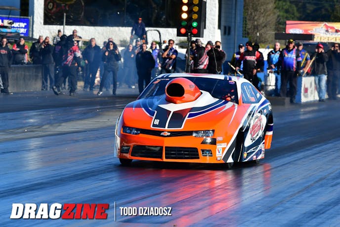 “The shifts have to be dead-on or it will throw the car off a lot. Everything has to be perfect to get a good run in, let alone a three-second pass. We went a series of 4.0s at the finals last year and none of those were perfect passes. The 1-2 shift is the most critical — if you’re early you cause the clutch to have problems and it will throw the run off. At this first event, you’re going to have to qualify well and run in the 4.0s to be in the mix during eliminations. The competition is going to be tough and you have to get the advantage on the tree and hit every shift.”