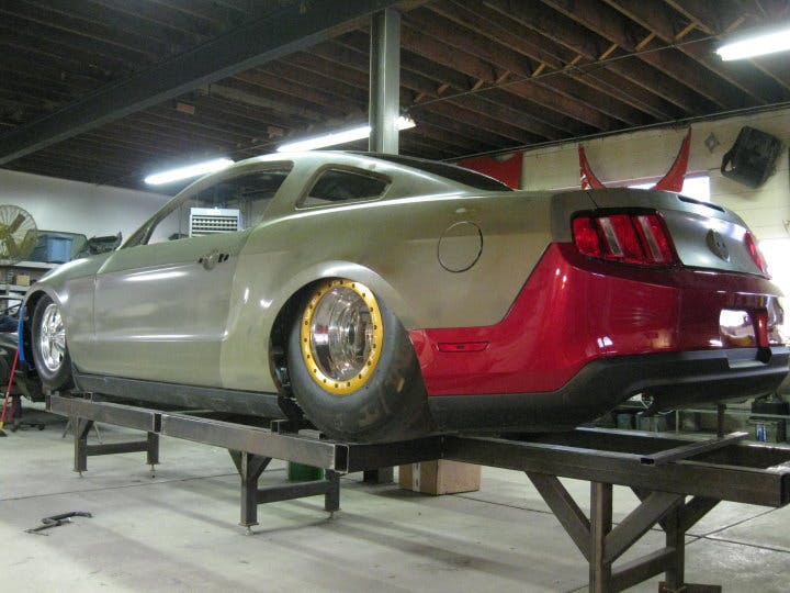 The fine details we’d all love to hear are being kept somewhat under wraps for now, but we do know that when it’s all completed we’ll see Kevin Sievers behind the wheel. Hard to tell from the limited quality photos, but it seems like there’s a F3-sized Procharger under there for mockup. The car sits pretty low the way it is as most of the bodywork is completed, it looks to retain a fairly stock appearance other than the slicks out back and skinnies up front. In cases like this, simple can be good as it really retains the sleek look of the 2010+ Mustang styling.