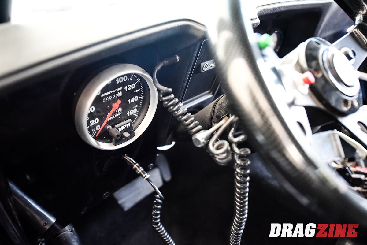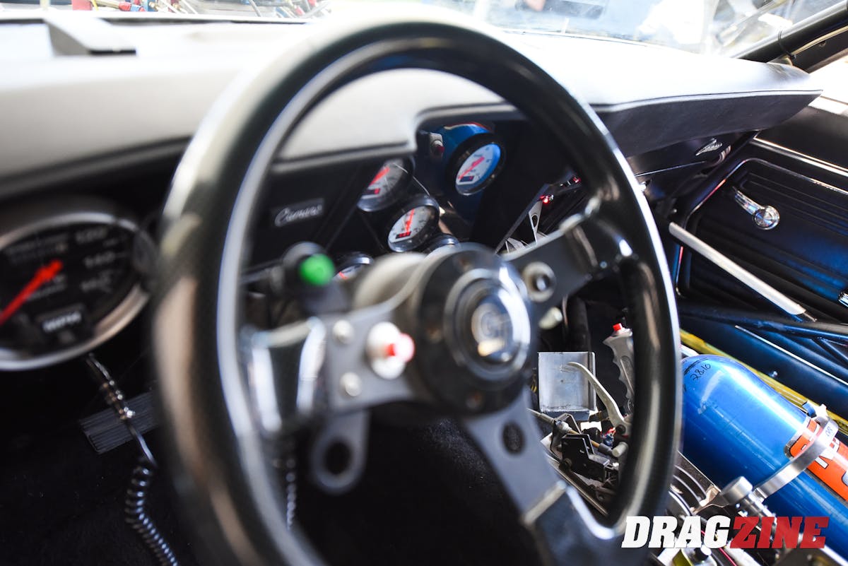 The front suspension features the Quarter-Max threaded adjustable strut mounts, and Weld Racing Full Throttle 15×3.5-inch front wheels. A fully loaded carbon-fiber interior from Quarter-Max features 48-inch carbon wheel tubs, carbon double-framerail transmission tunnel, and carbon flat sheet panels. The cockpit features a Quarter-Max carbon-finished steering wheel and C02 bottle, carbon-finished K&R delay box, MSD power grid system, and Racepak V300 data system.