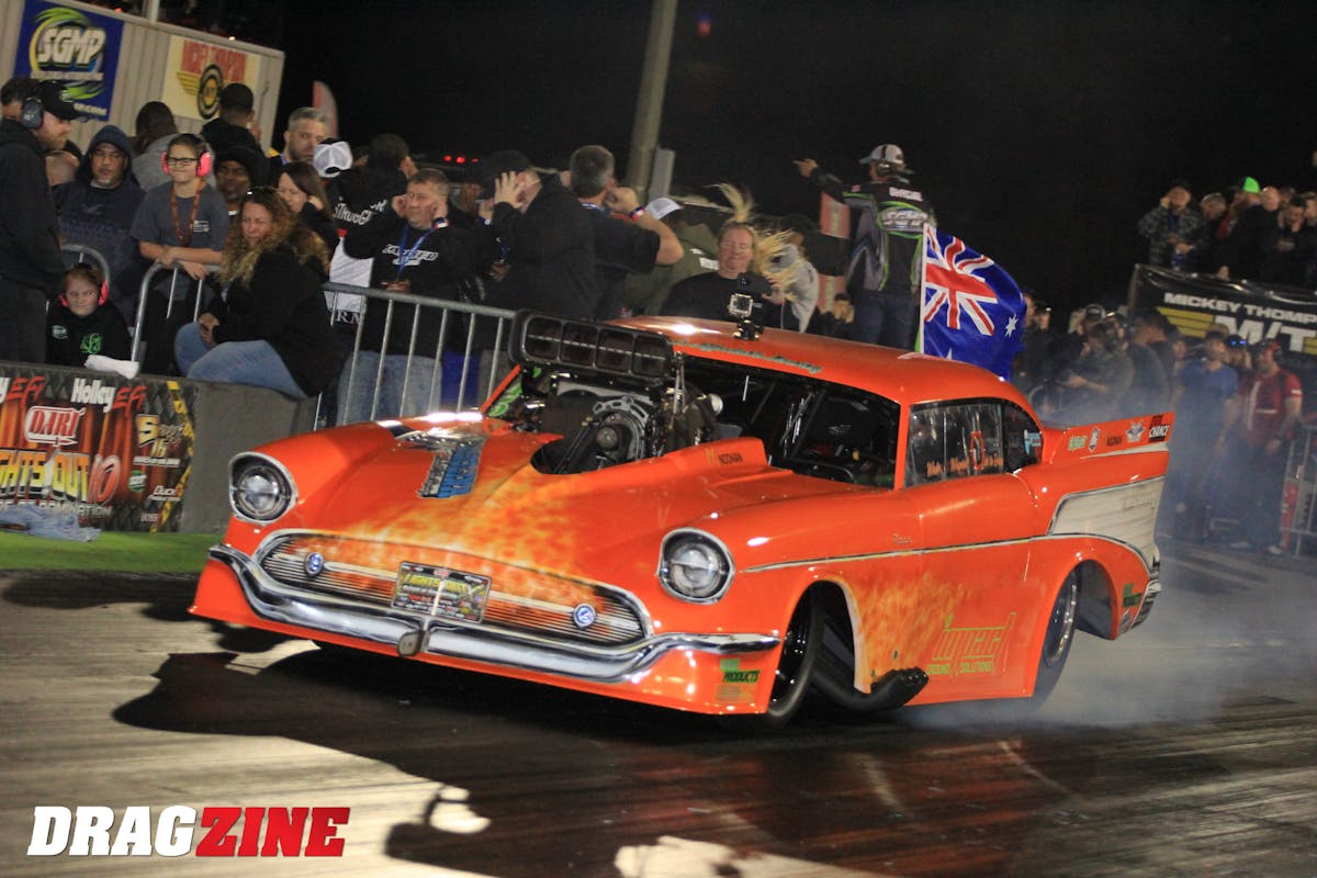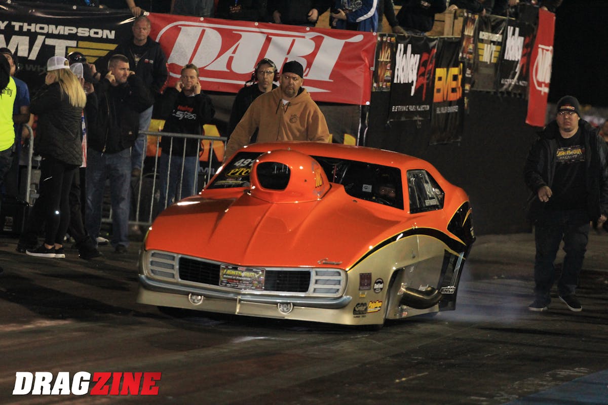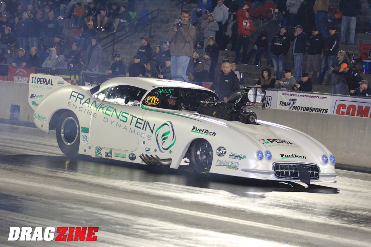 During Thursday qualifying he shut the car down short of 1,000 feet and coasted to a 6.22 at just 169.23 mph, good for third on the sheet. On Friday, he again slowed to a 6.35 at just over 140 mph, setting the stage for what he and Tecklenburg planned to be a kitchen-sink run in the first round of eliminations.