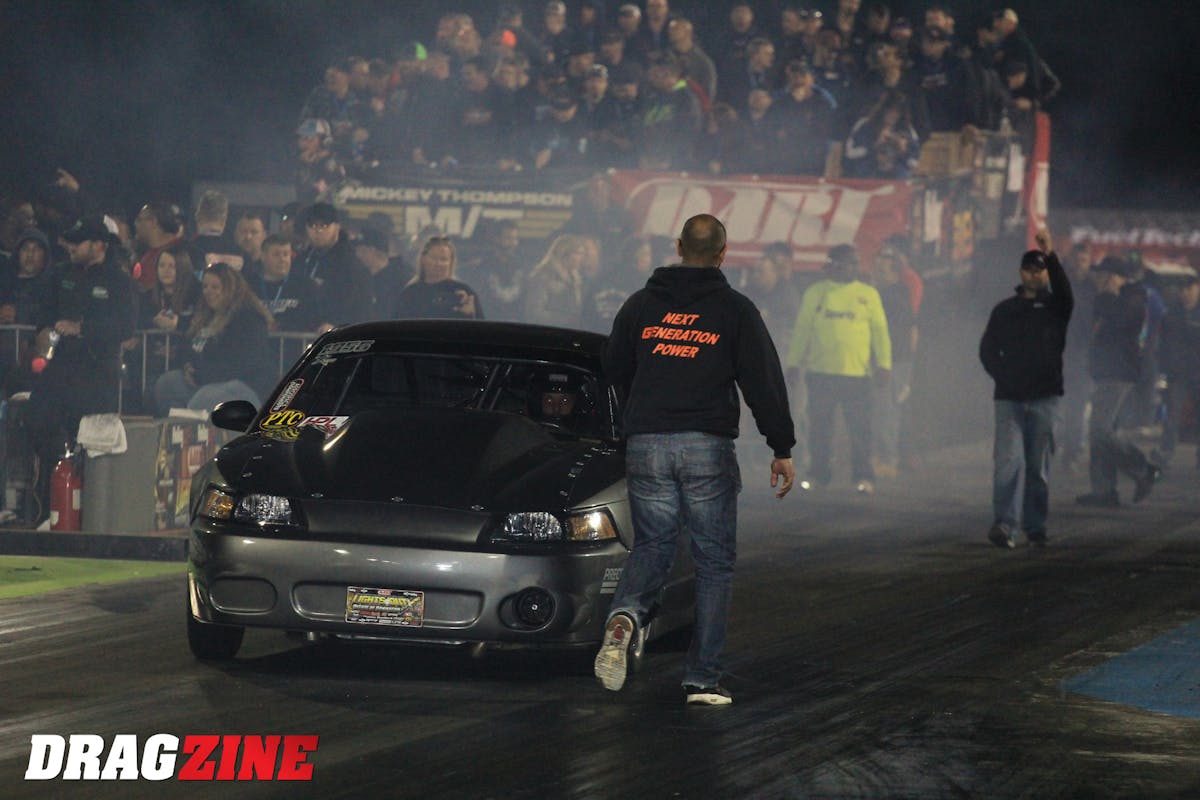 With the combination backed down from the 60-plus pounds of boost it was at in qualifying, Fitzpatrick rolled to a 5.841 at 241.21 mph, compliments of a 1.008 short time and a 3.820 at 195.62 mph. Fitapatrick was dead-late against opponent Mike McBrair and barely caught him in the lights, but it was all for naught, as NHRA officials, fully aware of his intentions, would have tossed him no matter the outcome.