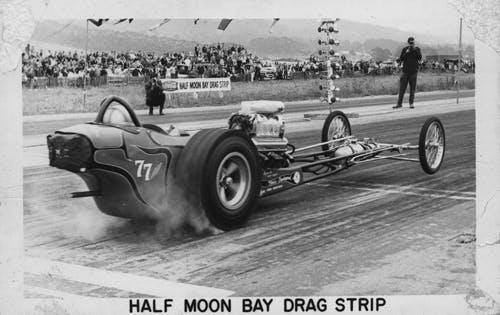 Two area car clubs, the Lightning Rods from San Bruno and the Piston Pushers from San Francisco joined forces with plans to conduct legal drag races on the airstrip that literally rests within a quarter mile of the pacific shoreline. Because none of the members of either club were 21 years of age, San Bruno police officer Dick Walrod signed on their behalf. The clubs held races at Half Moon Bay for two years, but later as more clubs urged to join and the city demanded demanded improvements to the strip and insurance put in place, the group was forced to give up it up from lack of funds.