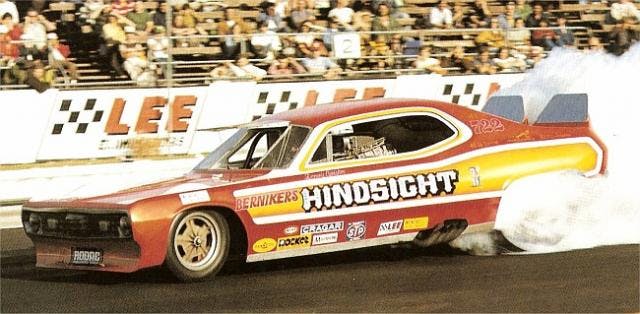 Bert Berniker had the Hindsight Plymouth Duster Funny Car built in 1973, and at the time he couldn’t have imagined just how fitting that name would soon become. Jim Adolph was the original driver of the car in the early part of 1974 during testing, but relinquished the driving duties to Fuel Altered pilot Dennis Geisler for the majority of the ’74 season. The car only ran in the seven-second range during a time when the front runners were running in the mid-to-low six second range at around 230 MPH.