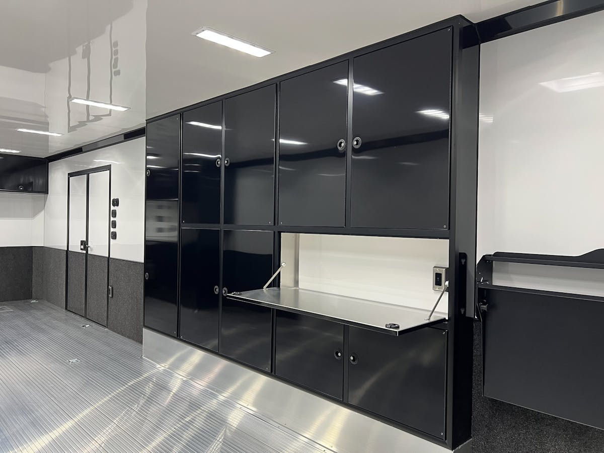 The interior layout is optimized for functionality, featuring an aluminum workbench, base cabinet with a closet, L-shaped upper cabinet, and a wheel well cabinet with a fold-down shelf. Extruded aluminum floors add resilience to the trailer’s structure.