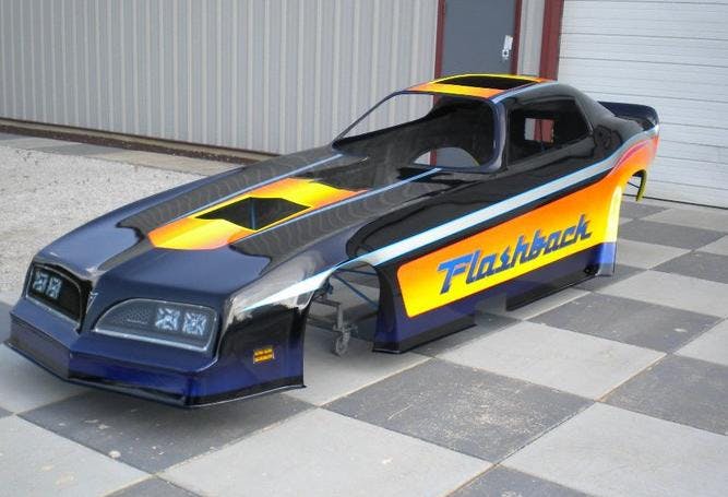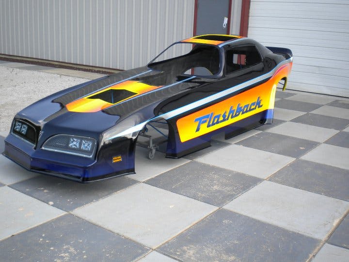 The pair purchased a Murf McKinney chassis from Don Schumacher Racing and have spent much of the last year putting the car together at Wilson’s shop in Winfield. Mo. Lurking beneath the slick ’77 Trans Am body is a 413 cubic inch TFX powerplant with Alan Johnson cylinder heads and an SSI supercharger. Created by RC Fabrications in Arizona, the body returned from paint two weeks ago featuring a colorful scheme with the “Flashback” lettering.