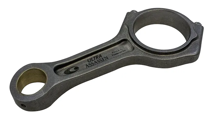 The Ultra H-beam connecting rods are designed to work with high RPM engines and other big horsepower applications. To provide leverage and reduce bore ovality at the top of the exhaust stroke, Callies tapered the big end outer profile of the Ultra H-beam rods. The big end gussets of the rods have been extended to tie the bolt spotface and centerline together, this proves equal distribution of the clamping force. Callies also designed the Ultra H-beam rod bolt threads to be fully engaged in the rod, used Ampco 45 material for the pin bushings, and implemented a twin rib cap design for the big end housing bore.