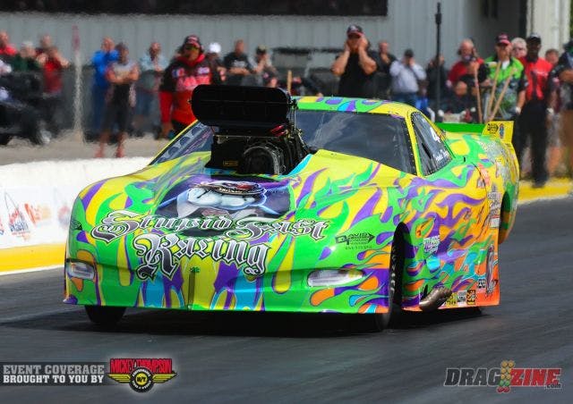 Taylor’s supercharged mount disposed of Jeffrey Cummins and his monster, nitrous-fed 855 cubic inch Camaro in the first round, 3.98 to a slowing 5.59, then No. 1 qualifier Todd Martin in the semifinals, 3.82 to a 3.90, and fellow Pro Extreme star and Texas native Brandon Pesz in the final round, 3.83 to an off-pace 4.19.