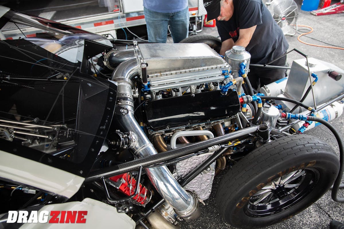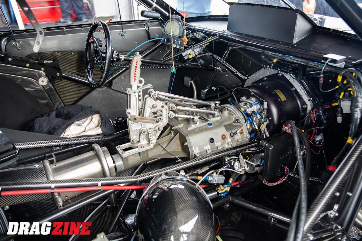 Hutter’s engine of choice is the 440 cubic-inch LS-based engine his father Ron developed. A CFE LSFusion block is the basis for the mill and it houses a Bryant crank, GRP rods, and CP pistons. The engine is topped off with a set of CFE SBX heads, and boost is provided via a pair of Comp Turbo CTR55-88106 oil-less turbos. A Quick Drive unit is paired with a Neal Chance torque converter and Liberty five-speed transmission to apply horsepower to the track. Hutter plans to shift the car manually for the foreseeable future since he likes having additional control over what the car is doing.