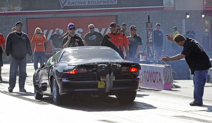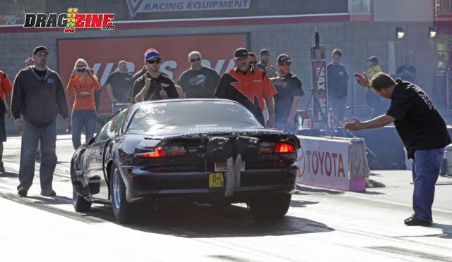 What you’re seeing in the photo above is not some sort of grudge race-style celebration where the winning racer drives back up the race track to meet his crew and the crowd at the starting line. It is, in fact, Drag Radial/True 10.5 competitor Mike Keenan staging his 1999 Chevrolet Camaro in reverse, while facing backwards, during Sunday’s first round of eliminations at the Street Car Super Nationals IX at The Strip at Las Vegas Motor Speedway.