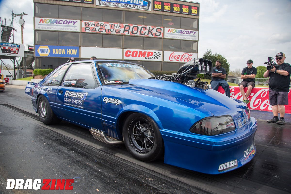 race winner and current record holder Rich Bruder, Dean Marinis in his nitrous car, Pro Mod standout Kevin Fiscus in Chris Matters’ turbocharged Mustang, Brendan Mills, and naturally-aspirated runner Alex Hays.