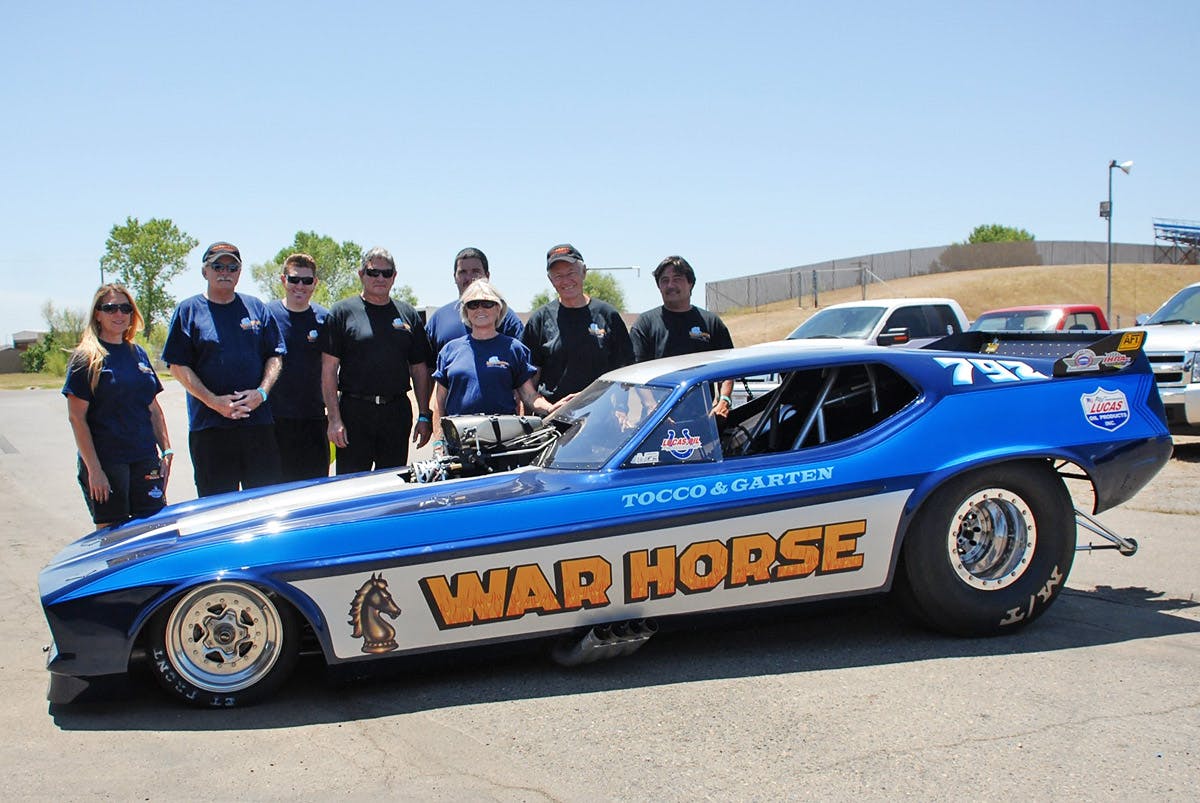 The Garten’s reunited with former partner Mike Tocco and jumped headfirst into the resurgent world of Nostalgia Funny Car racing with a complete re-creation of the original War Horse, with a 1973 Ford Mustang body draped atop a Plueger chassis with a BAE and AJPE Hemi powerplant and shod with Mickey Thompson tires. Garten and the new War Horse made their competition debut at the March Meet in 2010, and to date, have carded a best of 5.87 seconds at 242 mph.