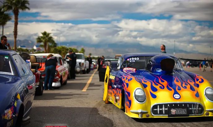 The Las Vegas Street Car Super Nationals features competition in Outlaw Pro Mod, Pro Mod, Outlaw 10.5, Extreme Drag Radial/True 10.5, Wild Street, Hot Street, Outlaw 8.5, and a host of index and bracket eliminators.