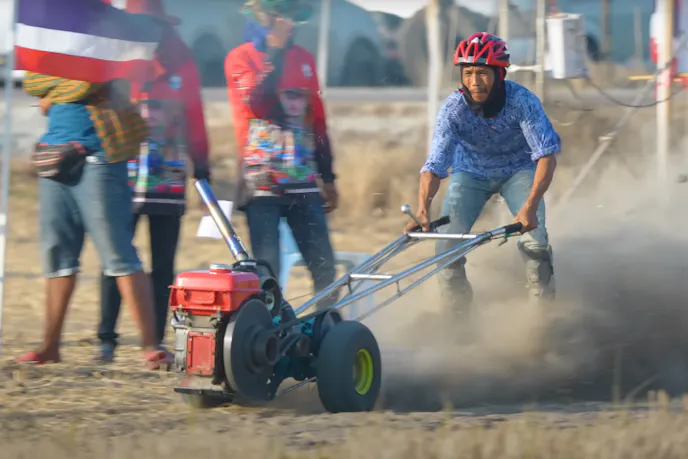 Even wilder yet, a rather large group of Bangkok locals have assembled highly modified rice tractors, based on the more primitive design of tillers used in the rice fields in the country, to hold acceleration contests. Traditionally sporting large mud paddles, many of them have also been converted to wheels and tires, while the engines have been, poked up, if you will. As any gearhead would, they then line them side by side and go at it down strips of dirt or literal standing mud and water, just like a rice field would be.