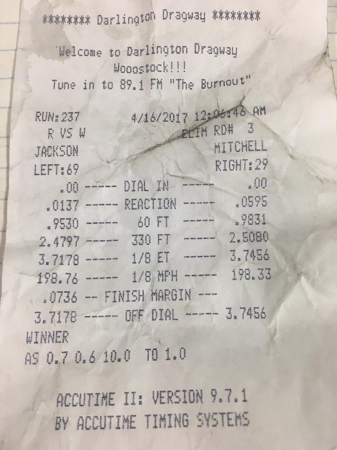 In Saturday evening’s barn-burning final round, Jackson strapped a .013 light on Mitchell and never looked back, clocking a stunning 3.717-second, 198.76 mph blast to down Mitchell who, despite a staggering 3.745-second, 198.33 mph pass of his own, was out of the race from the drop of the tree. On the record-breaking run, Jackson was .953 to sixty-feet and 2.479 to half track.