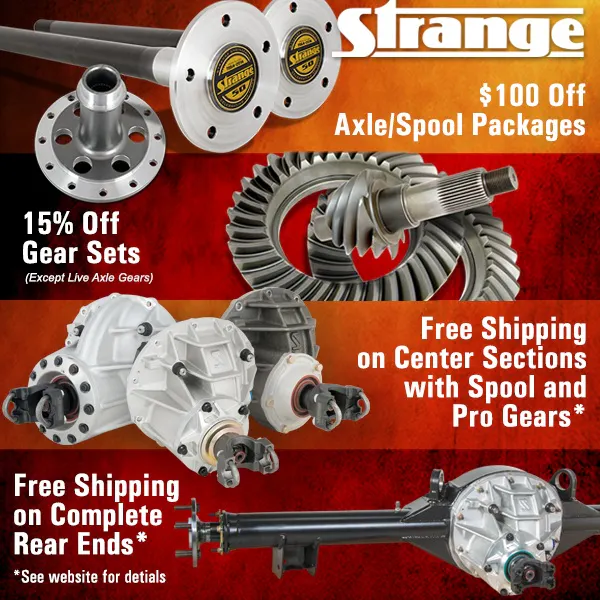 The gear set discount applies to standard and pro gear part numbers. Strange stocks U.S. Gear, Motive Gear, Richmond Gear and Dana/Spicer gear sets. Strange has an extensive inventory, yet warns that some ratios may go fast.