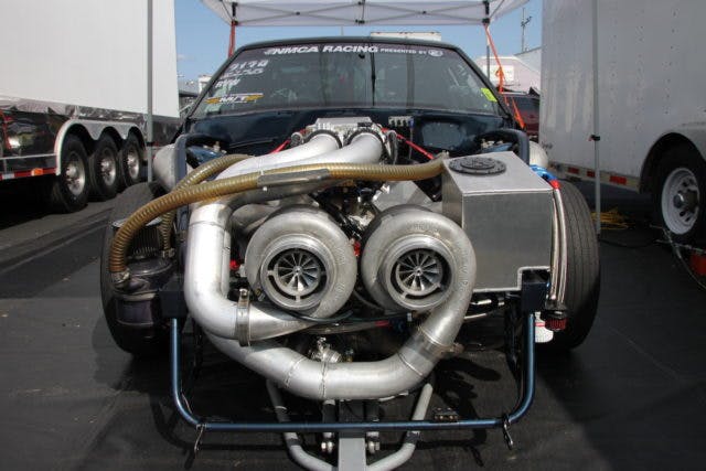 They fabricated a new set of headers, and fronted their masterpiece with the 88mm Garrett GTX 5018R turbos they had been running. To help put the power to the pavement, they put their Rossler TurboGlide and ProTorque converter back in place under the car, which rolls on Mickey Thompson 10.5Wx33 slicks.