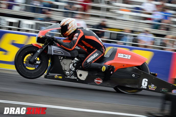 Andrew Hines possesses the largest lead of the four professional categories, 115 points ahead of second-place Jerry Savoie in Pro Stock Motorcycle. Eddie Krawiec is 116 behind, while Matt Smith and Karen Stoffer trail by 117 and 124, respectively. The remaining competitors in the two-wheeled category have been eliminated.