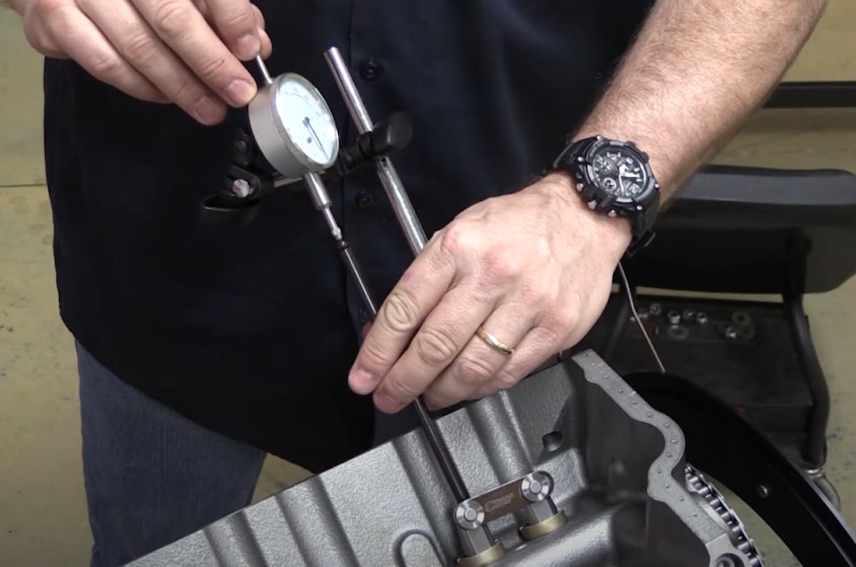 Step one is finding top dead center (TDC) for the number one piston. To do this, mount a dial indicator to a deck bridge, mount that on the cylinder deck surface and make sure the indicator is in the center position over the piston. In some instances, the piston can rock in the cylinder, and having the indicator in the center of the piston will limit any change in piston height should the piston rock in one direction or the other.