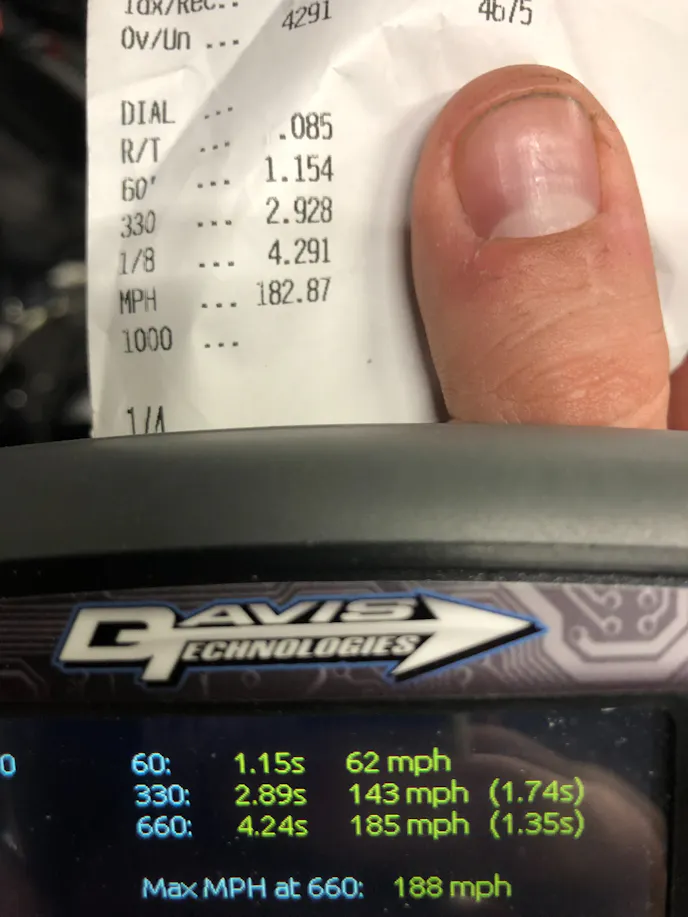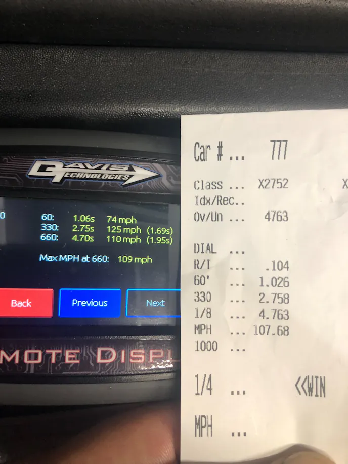 The virtual timeslip function of the VPS is an amazing tool that racers can use to keep track of each pass. The VPS will calculate velocity multiplied by time through its sensors to provide your elapsed time to a certain distance, with incredible accuracy. This function is very useful to have if there’s ever a timing system error, or you leave before the tree is activated. Thanks to the virtual timeslip function, you won’t have another wasted run without a timeslip again.