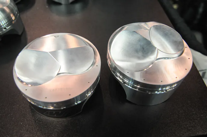 The pistons shown here, a demo product of the soon-to-be-released model, are lighter than the previous version and pack higher compression designs. Made of 2618 high-temp Alloy and constructed as a strutted-style forging, they carry many of the same great features of the original, albeit with many lofty improvements, including their compression ratios up to 14.5:1. They’ll also feature larger domes, hollow in design for lighter weight.