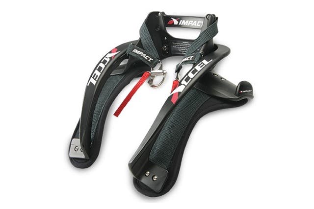 Impact’s Accel is made from a DuPont carbon fiber composite material and weighs a mere 1.8 pounds, resulting in less driver fatigue on race day. The design and choice of materials in the Accel FHR allows the device to flex in unison with the body during the course of competition thus minimizing driver fatigue and pressure points.