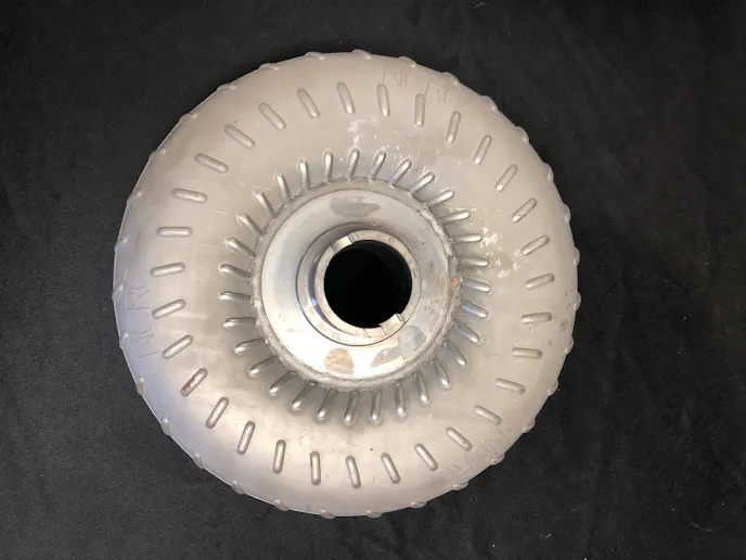 The specific tooling is both proprietary and top-secret, but Chance explains that the components effectively begin as sheet metal that goes into an “enormous press” and stamps the material into the torque converter shell. Then, the blades and turbine ring are stamped individually. All of it is then placed inside a converter in a tooling press, which bends the tab down that holds them all together.