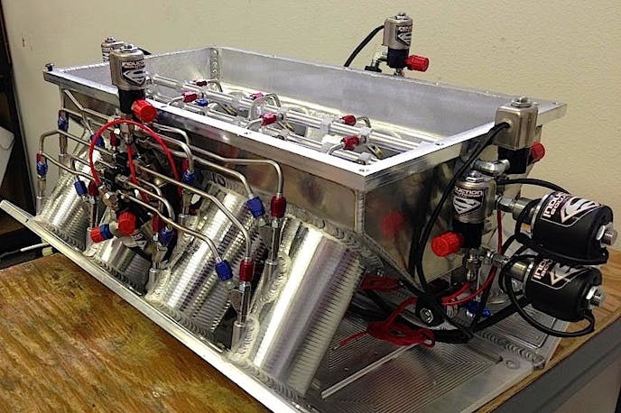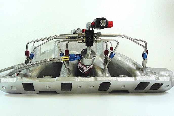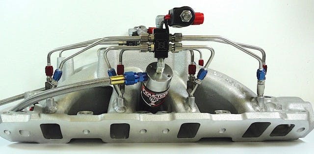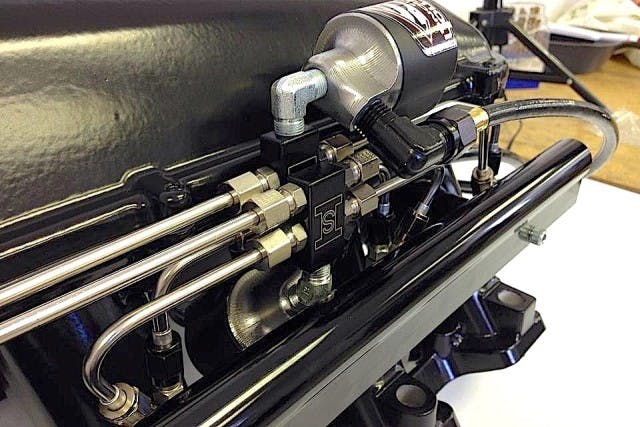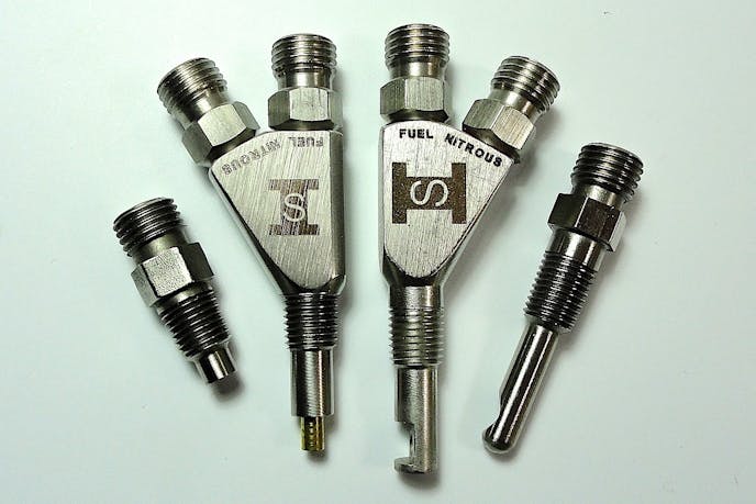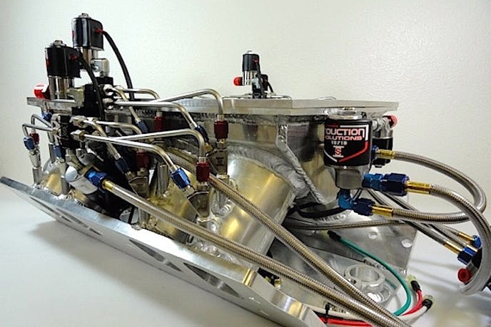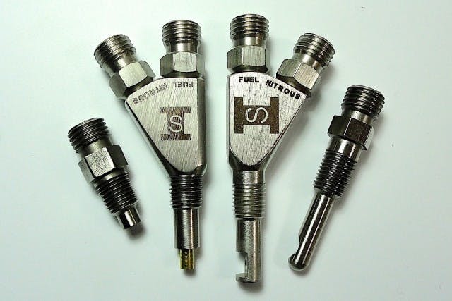 A more efficient and powerful system called direct-port nitrous places individual nozzles that blend and atomize the nitrous and fuel, then introduces that mixture directly into each intake port. Again, solenoids are used to feed the nitrous or fuel to the nozzles, which control the flow with jets at each inlet. This basic arrangement is called a single-stage system. When two complete sets of nozzles, or two for each cylinder, are mounted on the intake manifold, then it’s a two-stage system. Some engines have four stages of nitrous. In fact, Johnson says those four stages can be split from bank to bank, effectively creating eight stages—each with their own timer.