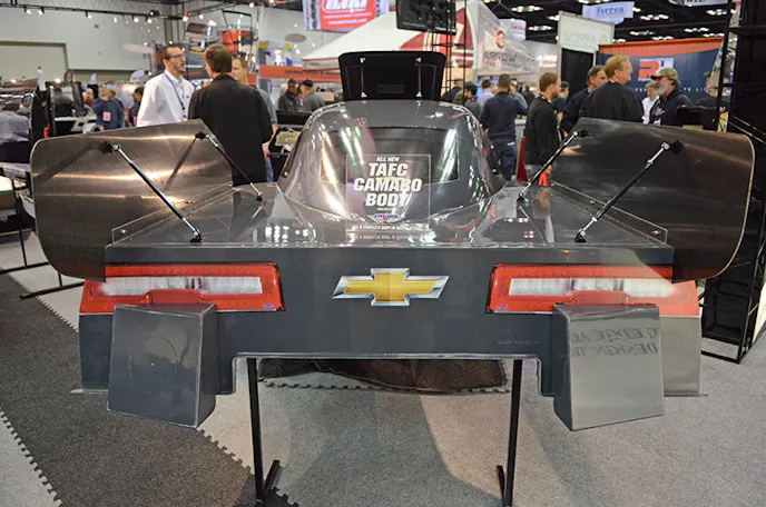 Coincidentally (or perhaps not-so-coincidentally), the folks at Five Star Race Car Bodies were busy at Indy unveiling their all-new Chevrolet Camaro Top Alcohol Funny Car body that, according to representatives on hand, could be adapted for use on nitro Funny Cars.