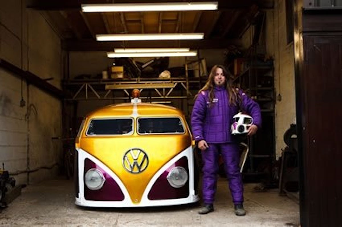 Allman’s ride, aptly named “Mental Breakdown,” is something of a shortened Top Fuelchassis, with a Funny Car/Fuel Altered-like cockpit hanging over the front wheels. It’s wrapped in roughly half of a Volkswagen “hippie van” with what appears to be functional doors and sporting a really sharp, nostalgic paint scheme. Out back is a supercharged Hemi, similar to what might be found in a Top Alcohol Dragster.