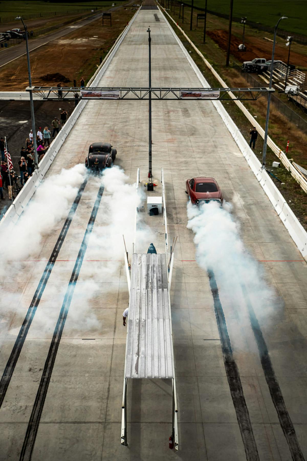 A 240×80-foot burnout pit was built next to the left lane, and a thousand people showed up to watch an event there in February…900 more than Adams and Trimp were expecting. A no-prep race was also held two weeks ago to christen the virgin concrete, during which a raffle was held to benefit the track upgrades to conduct the two very first burnouts on the pristine white concrete surface. “You saw tire-smoke, the black streaks behind them, and nothing but fresh concrete ahead of them,” Adams says of the scene that day.