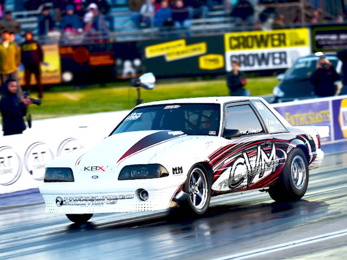 The two X275 heavyweights dueled back and forth at Holly Springs’ Fall Brawl 4, where Bruder emerged with the race win and another 4.38 under his belt. This weekend, however, Johnston was not to be denied, at least through the qualifying rounds. Jared wheeled his KBX-built Fox body Mustang to a scintillating 4.37 elapsed time to reclaim the throne in one of the most competitive, tightly-policed classes in small-tire drag racing. Johnston, a resident of Raymor, Missouri, hooked up with the minds behind KBX, Ford engine guru Jon Bennett and small tire wizard John Kolivas, to build the White Riot ‘stang as the shops’ first car purpose-built from the ground up for X275 competition. The car is relying on the tried-and-true 85mm turbo combination, despite the hefty weight penalty, to get the job done.