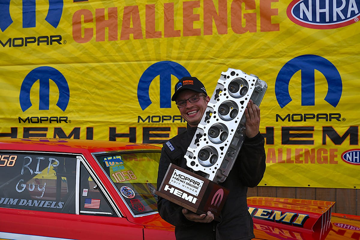 Jimmy Daniels is two-for-two in the Mopar HEMI® Challenge. The 21-year-old driver from Yardley, Pennsylvania, made his second start in the prestigious annual event on Friday during the NHRA U.S. Nationals at Lucas Oil Raceway at Indianapolis, and drove his 1968 Dodge Dart to the winner’s circle for the second consecutive year.