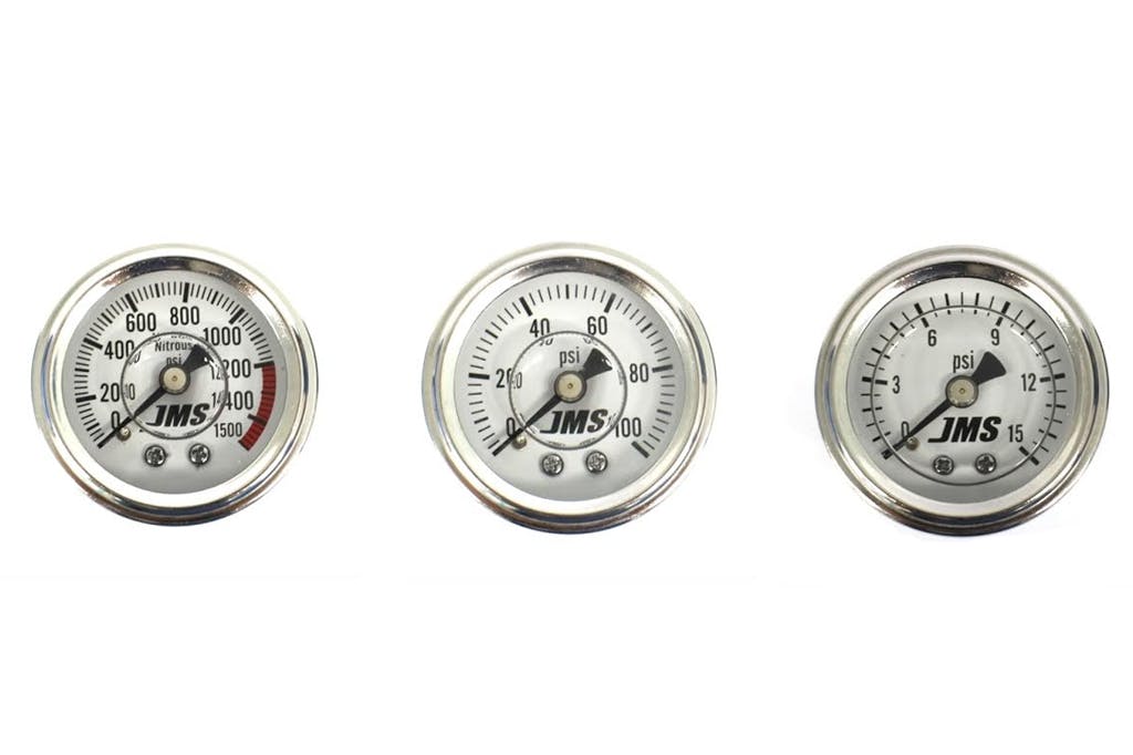 JMS 1.5″ Liquid-Filled Gauges are designed to provide precision readings, and are filled with a glycol-based solution to provide the ultimate in reliability and vibration dampening for the most demanding conditions. High-quality gauges are critical elements when tuning your nitrous or fuel system and JMS offers the perfect gauge for all; automotive, marine, power-sports, and racing applications.