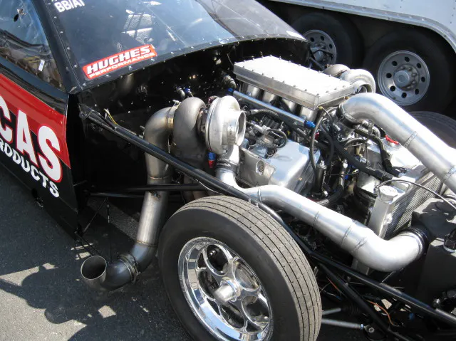 The general underlying paint scheme stayed the same, though all the Aeromotive decals were removed and replaced with ones from Lucas Oil Products and Accufab. The car is now powered by a 281 cubic inch 4 valve modular motor that gets the boost charge from a set of 80mm Precision turbos. Dyno testing of this combo resulted in 2500hp at 9200 rpm, quite the number for a relatively small engine. Rumor has it that this is the same engine as what powered the Accufab Cougar, backed up by the same Lenco transmission as well, so they’ve got numerous hours of data and testing with this drivetrain. The car weighs in at about #2460 with John in the car per PSCA’s Pro Street rules. One other noticeable change is the upturned exhaust that many teams have been experimenting with, seems to be working well also.