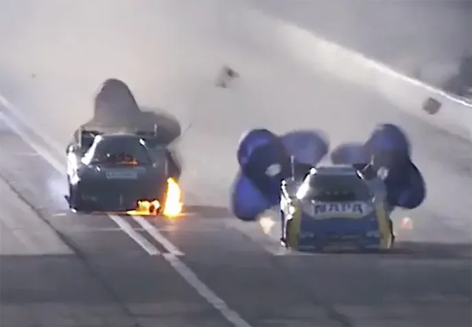 Thanks to improved fire suppression systems, changes in carbon fiber materials and coatings, and fewer catastrophic engine failures in general, Funny Car fires aren’t quite the frightening, four-alarm blazes they were a couple of decades ago when John Force was making himself famous by burning a car to the ground every weekend, but things can still get a little heated in a flopper these days, as a pair of part-timers — Jon Capps and Shane Westerfield — learned over the weekend.