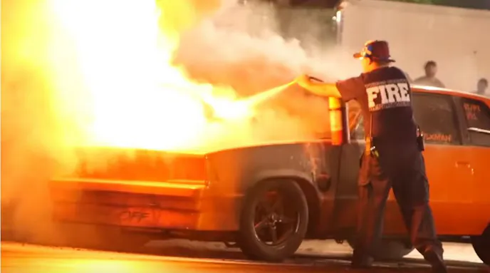 As the Malibu continues to move, the fire only intensifies, causing the driver to make a hasty exit. Just as the Milkman gets out, the front of the Malibu explodes with more fire as more fuel and nitrous are exposed to the inferno. Thankfully, the safety team arrives and began to hit the car with fire extinguishers to put the flames out.