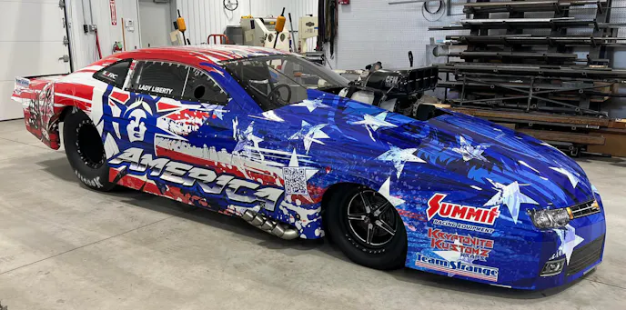 The new patriotic wrap and car name were inspired in part by a similar wrap that Haney ran when he made his NHRA Pro Mod debut with Rickie Smith Racing in 2018. With a red, white, and blue theme, the wrap celebrated Summit Racing Equipment’s 50th anniversary. The new look generated rave reviews from fans, so Haney and his team called on longtime partner Kryptonite Kustomz to design a similar look for “Lady Liberty.”