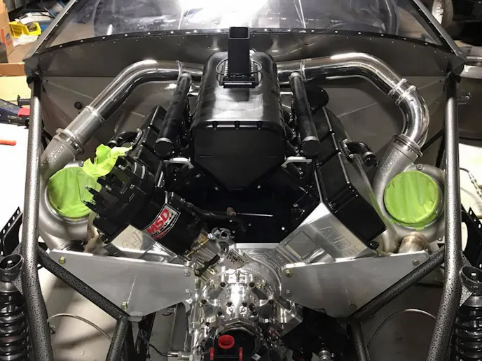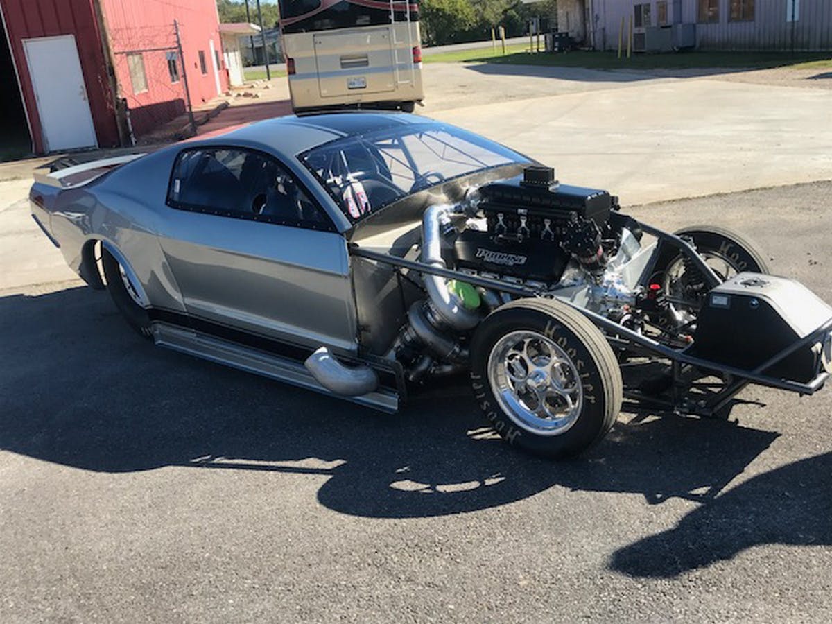 The 2015 Mustang body sits on a Tim McAmis chassis that Dan Parker at DP Race Cars put the finishing touches on. Powering the Mustang will be a stout ProLine Racing Engines 481X Stage 4 engine that will get boost from a pair of Precision 102mm Pro Mod turbos. Kelley built the turbo system himself and added Turbosmart blow-off valves and a pair of Precision wastegates. Gear changes will come courtesy of an M&M Transmission that’s matched to one of their lock-up torque converters. Kelley will get his data from a Racepak system to help him tune the FuelTech ECU. Under the car to put the power down will be a full McAmis floater rearend with Menscer Motorsports shocks in the back and Lamb Components struts in the front.