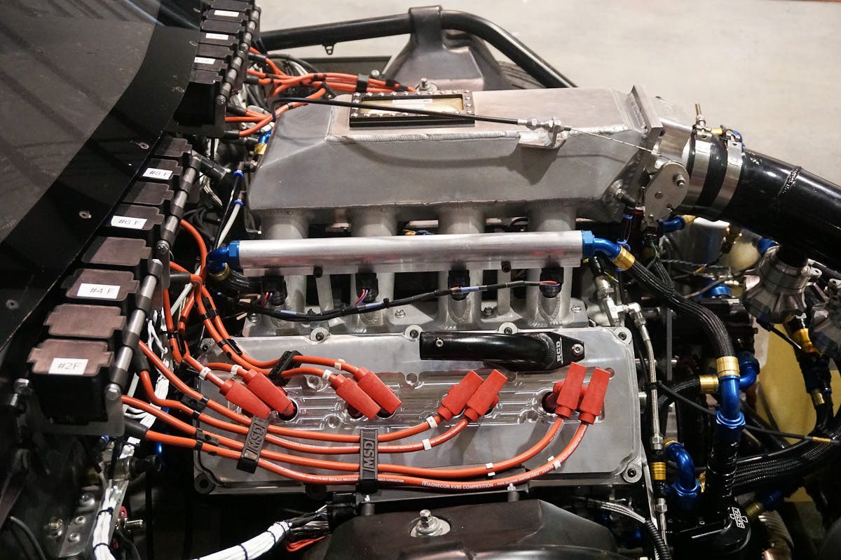 Mullins and his TKM Performance shop built the 440 cubic-inch Gen III Hemi, which Schurr says he instructed him to build as though it were a Radial vs The World engine, but with some degree of reliability — a solid aluminum block, billet crank, aluminum rods, aftermarket Darton sleeves, and so on. The powerplant will run on M1 methanol, which necessitated the addition of the eye-catching array of 16 coil packs (and M&W spark boxes) that are mounted along the firewall to fire in conjunction with the new FuelTech FT500 engine management system, which was installed and wired at Pro Line Racing in Georgia last week.