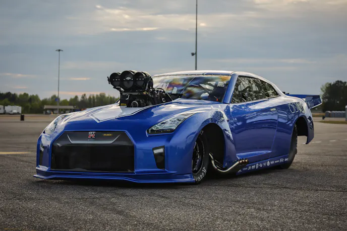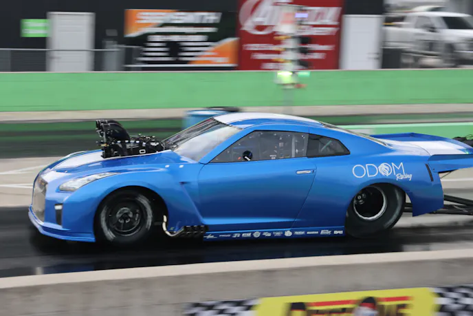The GTR that David Monday Race Cars built for Odom is truly one of a kind. Odom brought a running and driving GTR to David Monday to use as the base for the race car. The final product still uses the majority of the OEM Nissan body panels. A 521 cubic-inch BAE HEMI topped off by a PSI supercharger was built by Howe for the GTR. A five-speed Liberty transmission and Bosshog converter send the horsepower generated by the blown HEMI to a Strange Engineering rearend. The engine is controlled by a Haltech ECU.