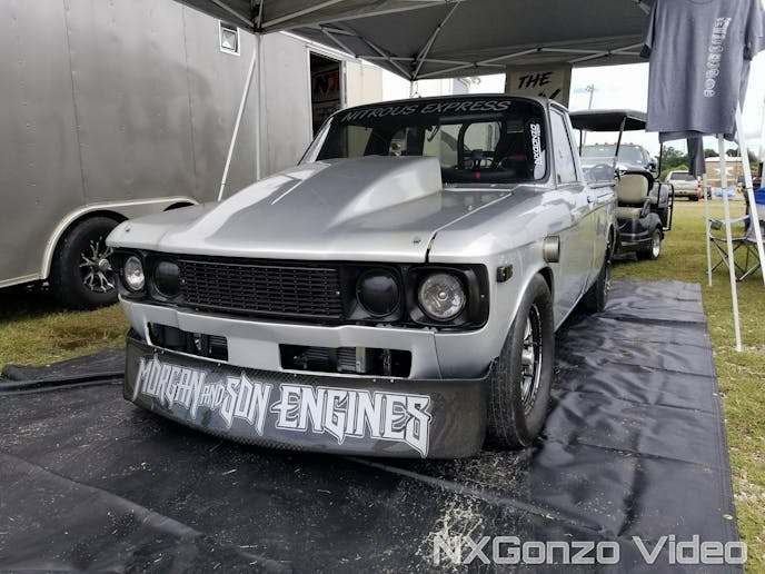 The 1976 truck that Buckmaster pilots is powered by a Morgan and Son Racing Engines small block that has over 400 cubic-inches of displacement. A single direct port system of Nitrous Express giggle juice provides the extra rip the engine needs, while a power glide transmission and PTC torque converter help to put the power down. The ladder bar suspension in the rear works with a set of Viking Performance shocks to make sure the Luv stays planted on the tricky No Prep racing surfaces it encounters.