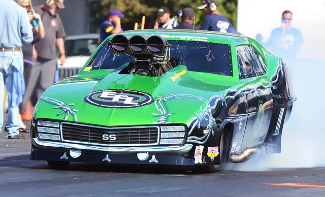 Team Green, owned by Rob and Anne Sporring of Guelph Ontario and Latino from Whitby Ontario, qualified atop the field with a 6.055 at 237.21 mph. Latino, aboard the G-Force Race Cars-built 1969 Camaro powered by a 521-inch BAE supercharged Hemi, carded a pair of 6.05’s in the opening two rounds to defeat Rocky Di Lecce and Derek Hawker before scoring his second race win of the season with a stellar 6.02 — the quickest pass of the event — to defeat of Jay Santos in the final run of the PMRA season.