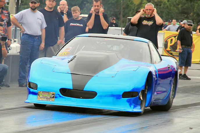 Barnett was racing alongside Jamie Hancock during the opening round of RvsW qualifying at Donald Long’s No Mercy VI drag radial race at the Adel, Georgia facility when, according to reports, a hung connecting rod led to significant engine damage at the conclusion of a 4.25-second, 175 mph run, causing the Corvette to immediately erupt into flames as it continued into the shutdown area. Barnett, fighting to bring the car to a halt, lost control when fluids got underneath the tires, sending the car careening nearly head-on into the guardrail before rolling to a stop in front of the already-rolling SGMP safety vehicle.